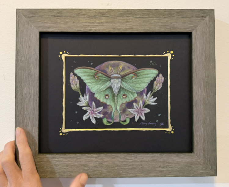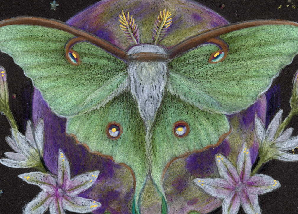 Luna moths are one of my favorite creatures to draw, and they show up frequently in my work. They hold a quiet mystery, and are usually only discovered at night. They are often seen as symbols of the moon, renewal, and spirituality.