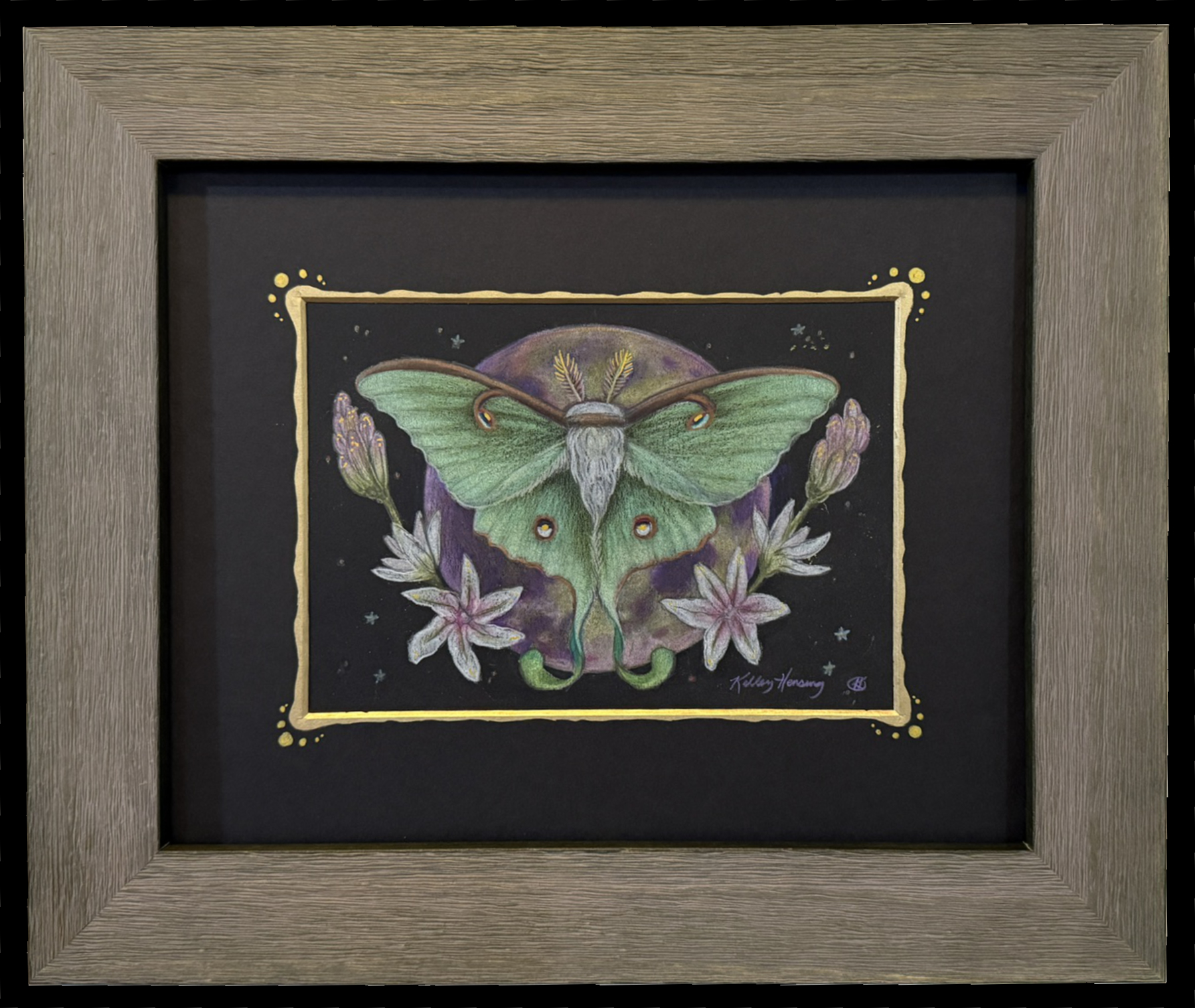 Medium: color pencils on black paper, gold paint embellishments. Frame is new/basic, composite wood texture. Black mat w/gold decor added, glass.