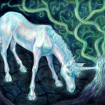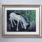 Healing Touch is a mixed media painting featuring a young unicorn healing a forest and starting new growth. This painting measures 9″ x 12″ and was painted on Fabriano hot press water color paper and is enclosed in a silver frame, ready to hang. Framed measurements are about 12.5″ x 15.5″.