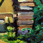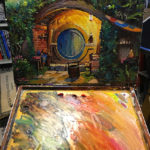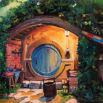 Here is a night shot of Hobbiton.  I like extreme lighting.  This warm concentrated lighting against the evening light, the soft cool tones of the sky was really attractive.      This is a 12 x 16 canvas panel done with oils.