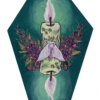 Illuminated is a small original gouache painting that is encased in a hand sculpted and cast deep, dark eggplant purple coffin cameo frame with a slight green sparkle-shift.It measures 9 1/4″ tall and 6.5″ wide, and comes with a chain attached to the back for hanging. It also comes signed, and with a certificate of authenticity.