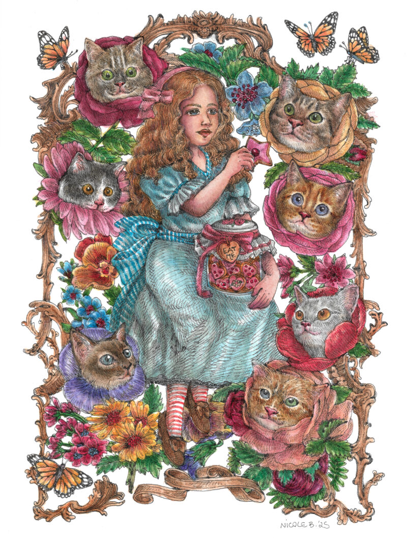 This is a special one. While I was working on it, I was caring for my 16-year-old cat, who became gravely ill and passed away before I could finish. She was the last of my three cats; the others had passed the previous year, at ages 17 and 20. In their final days, they felt so fragile, like delicate flowers I was trying to keep alive. Caring for them created a kind of quiet isolation, as if we existed in a world suspended from reality. Now that they’re all gone, that time with them feels like a dream or something that happened long ago, in a gentle, faraway Wonderland-like world. I feel privileged for the time I shared with my furry children, and I put those happy thoughts and memories into this piece.