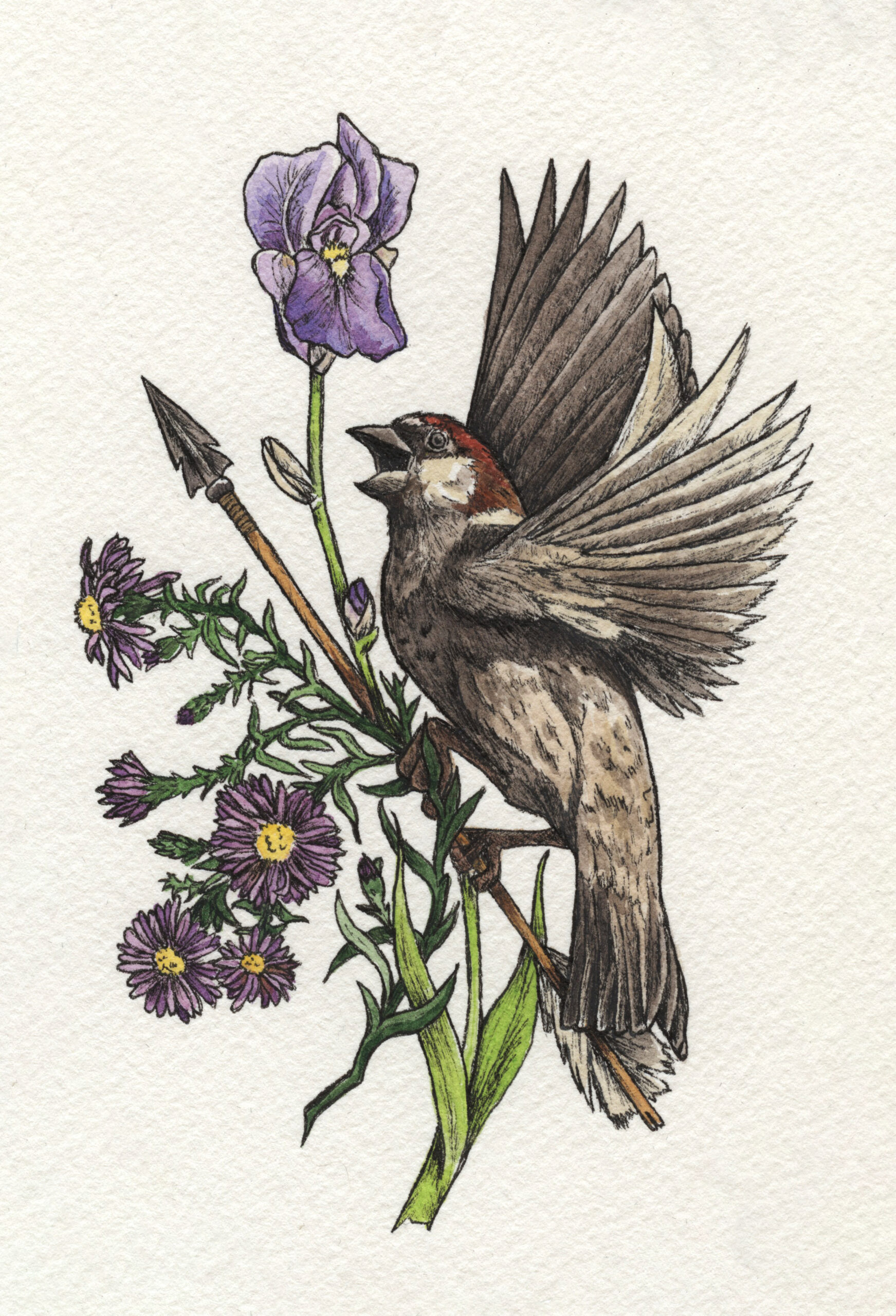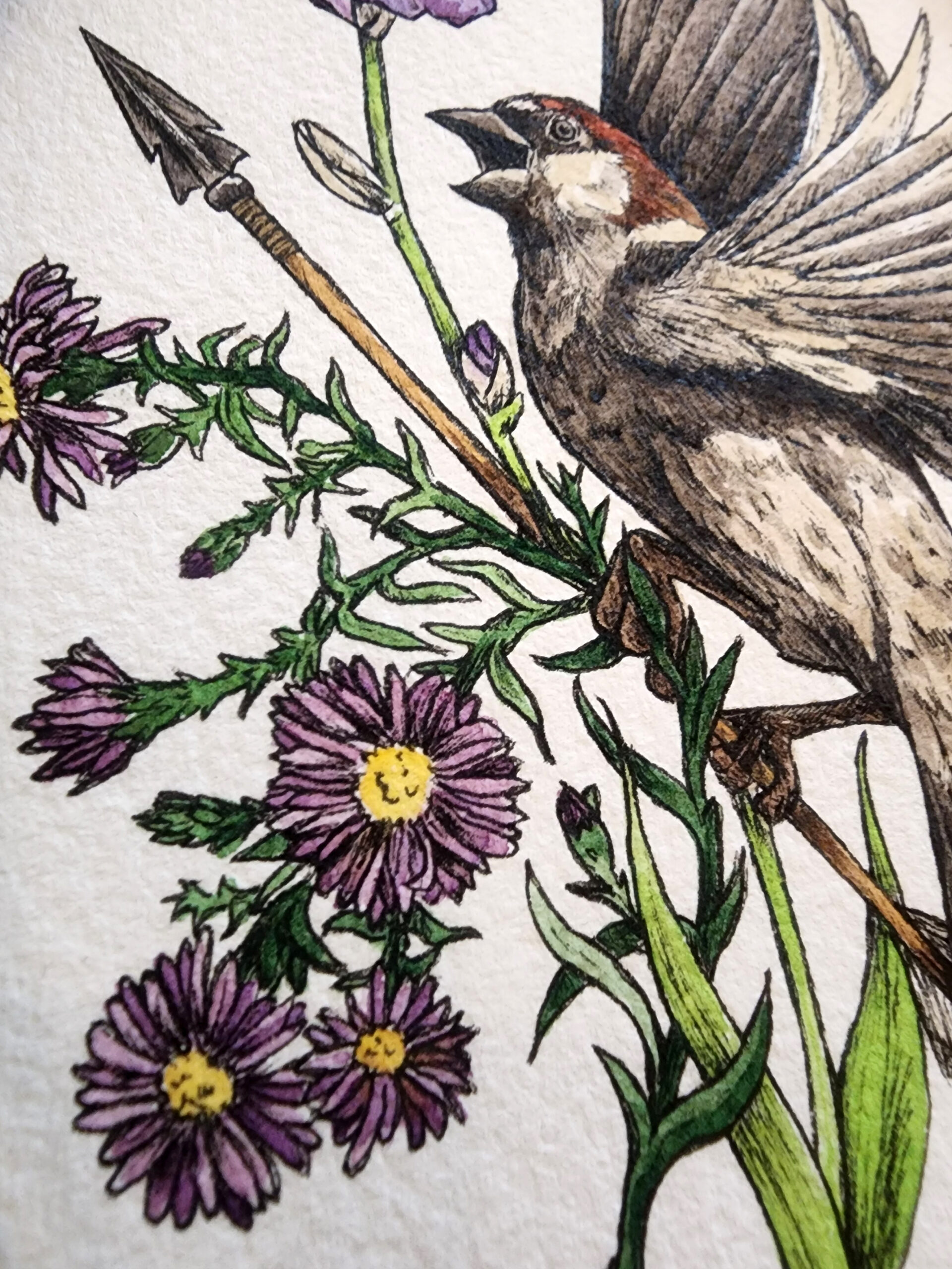 This piece draws heavily on my research into the symbology of the natural and mystical world around us. Sparrows are often associated with resilience, protection and adaptability. Irises represent faith, hope and courage. And the Aster flower symbolizes perseverance and patience.