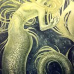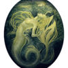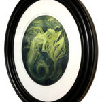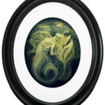 “Incipient” is an original watercolor and acrylic painting on 140 lb hot press watercolor paper measuring 8″ x 10.” The painting includes iridescent gold shimmers throughout. The painting is matted in an oval 11″ x 14″ black frame.