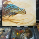 This painting was started in July while selling my artwork at Evermore Park, an immersive LARP experience with quests, goblins, dragons, and much more. This year’s season of Mythos being the Dragon Lantern festival, painting a dragon live there was very fitting.