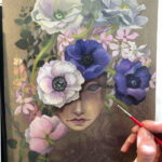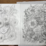 I also thought I’d share a few pictures of my process. The rough drawing on the left was an image I created in my head, used to balance out the shapes. At first, the head was going to be a heart, though I later changed it a hidden face, as the flowers’ centers reminded me of eyes and I thought it would be interesting to blend hers in with them. (The heart idea will be a future version~) I then added other types of blooms and foliage from pictures I’ve taken over the years, to create a subtle spiral flow.
