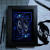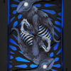This jackrabbit playing card artwork is based on the black rabbits in Guillermo del Toro’s Pinocchio. I loved the film and knew immediately that I would want to create art based on the amazing designs. As it is also the year of the rabbit, this seemed a very serendipitous piece. The artwork incorporates many layers of cut paper, including some with holographic and mirror effects, and the rabbits painted in watercolor. The unique papers and glow-in-the-dark eyes of the rabbits are so special in person!