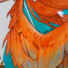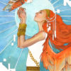 6 x 8 inches, mixed media (watercolor, gouache, ink) on hot press watercolour paper. Leaves, belt, headband and bracers are gold metallic paint. Painted in parts with neon orange acrylic, this piece has an amazing glow in the hair, owl and wings that’s hard to capture with photography.
