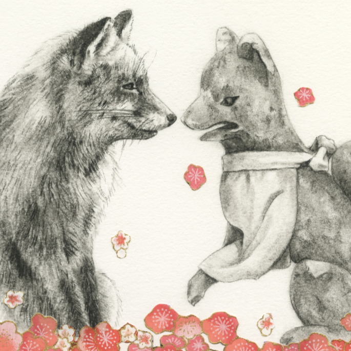 This drawing is inspired by my latest trip to Japan, where my heritage is from. I really connect with the folklore behind foxes, kitsune, and wanted to honor that with this drawing. I had taken a photo of the kitsune scuplture on one of my trips to Japan.