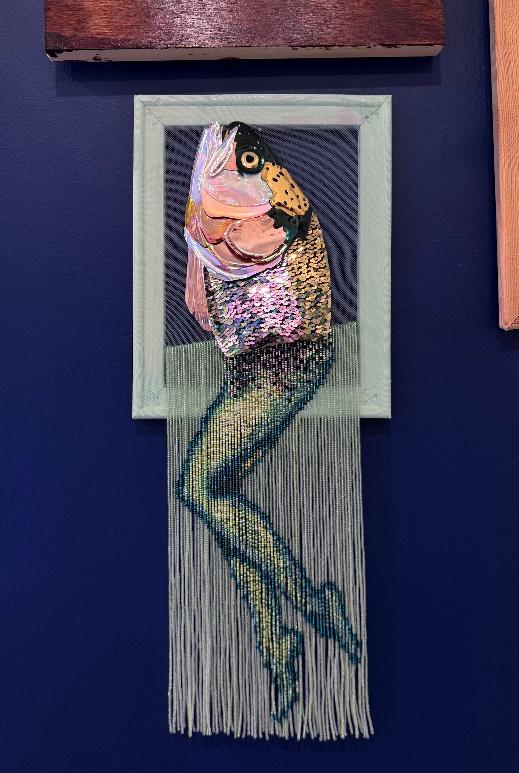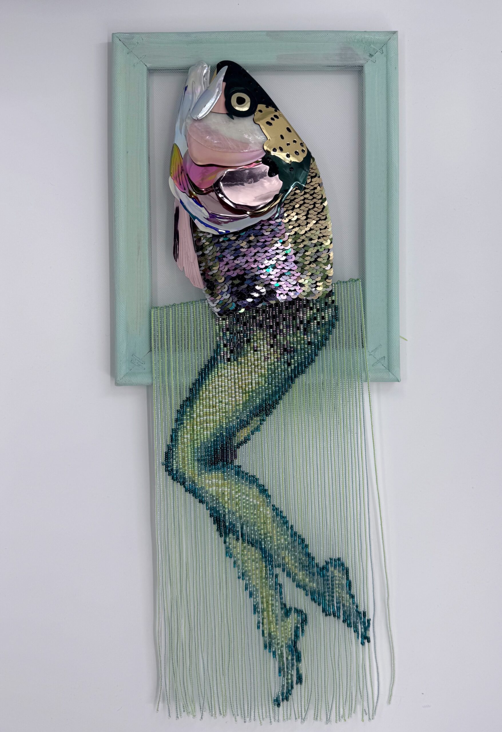 Materials: sequin film, mother of pearl shell, sequins, glass and resin beads, felt, thread.