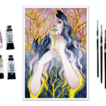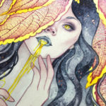 “Limerence” measures 8.75″ x 12.75″ and was painted in watercolor on Arches 140 lb hot press watercolor paper. It includes iridescent watercolor embellishments as seen in detail photograph.