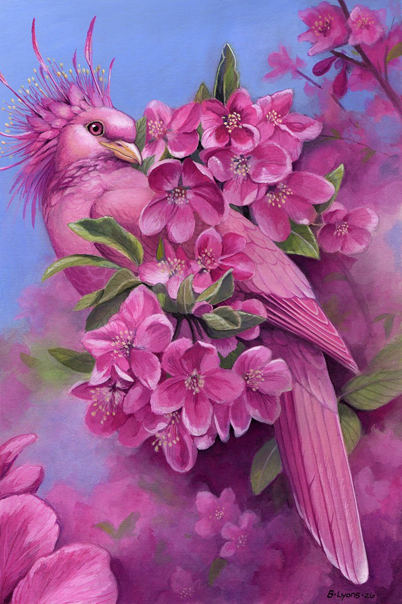 Gouache on soft-press watercolor paper, 9 X 13.5 inches. This painting is double-matted to 14 X 18 inches.