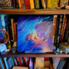 This piece was created with acrylic, oil pastels, and glitter confetti on wood panel. It is varnished and very saturated and shiny. It shimmers and catches the light in very exciting ways. It’s perfect if you love celestial fantasy art.
