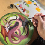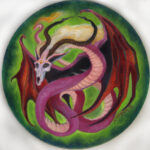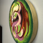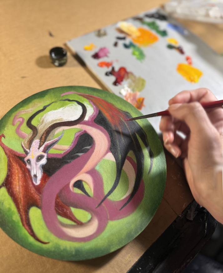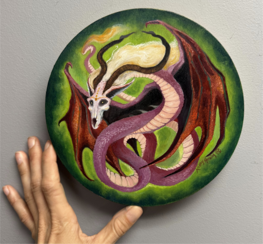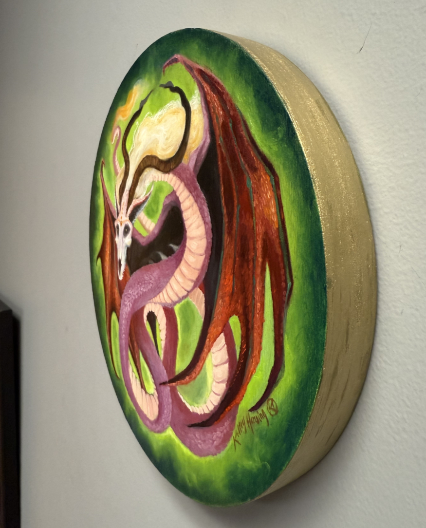 I’d sketched out this little twisting dragon from my head, while trying out the surface of a small round wood panel I’d bought. I enjoyed being spontaneous as I continued, blocking in the underpainting using bright acrylics, then finishing the final piece using oil paints.