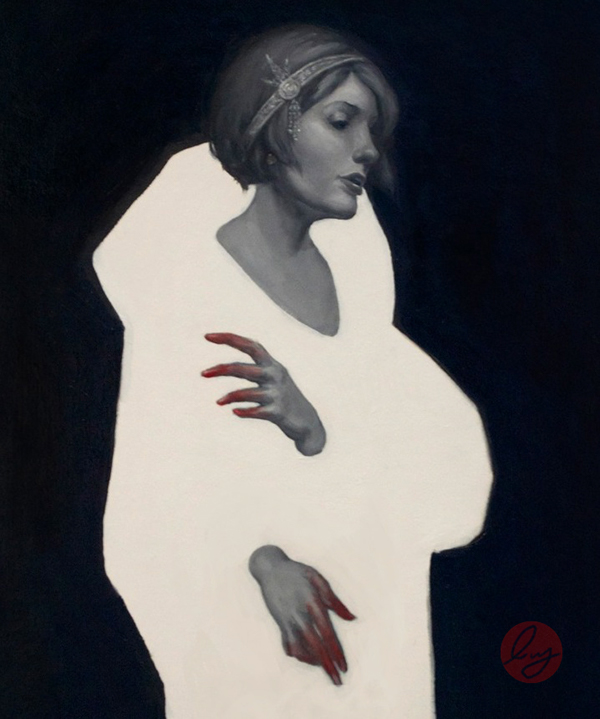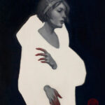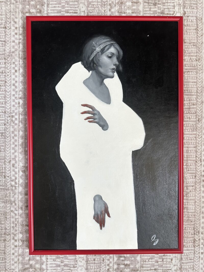 I remember when Maggie came by my studio and saw the piece on my wall. I love meeting the artists behind the work I collect. Maggie’s work, especially these gallery pieces, are beautifully painted and always have a question, an edge, a question. I look at this piece and wonder about the figure’s inner world, the stark background in contrast to a clearly rich experience.