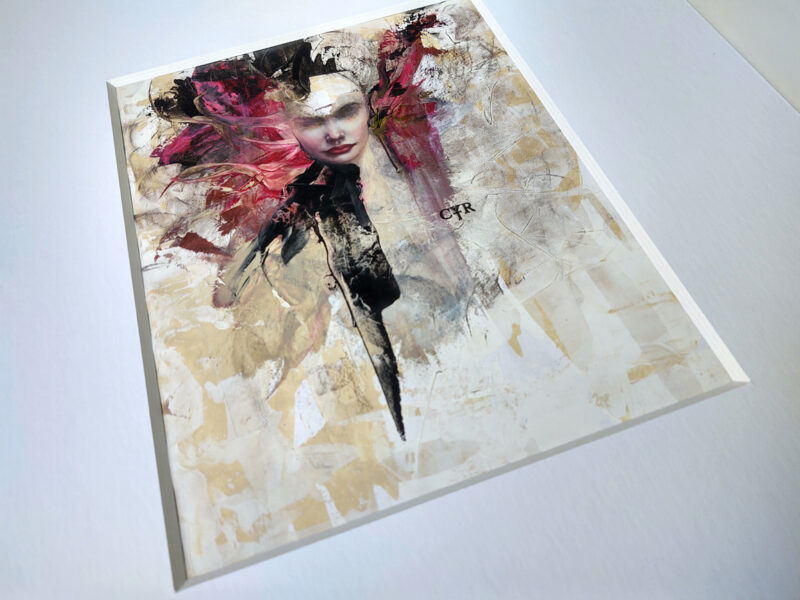 Symbolizing the often heightened, sensual experience of the theatrical operatic stage, the female figure looks through a porcelain-like mask and wears a crimson feather costume that resembles the petals of a flower, blossoming in the passion of the moment. As we experience a higher consciousness, we are transported to a magical place, even if it is just for a moment.