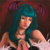 My take on the Darkstalkers character Morrigan Aensland – in a contemplative pose reminiscent off moody gothic portraiture. Morrigan Aensland is a character from Capcom’s Darkstalkers series is a succubus and a powerful princess (later queen) of the demon realm Makai, who is very vain and lives for little more than the excitement of battle, but slowly begins to take her royal responsibilities more seriously despite her obsessive fascination with the human world.