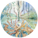 Watercolor painting is 4″ tondo. Full assemblage dimensions are 6×10″.