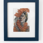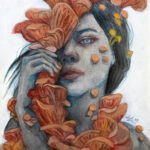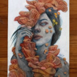 Mycelia is a 5″x7″ mixed media painting (ink, acrylics, and colored pencil on Fabriano hot press watercolor paper) depicting a lovely mushroom portrait. Framed and matted to 8″x10″.