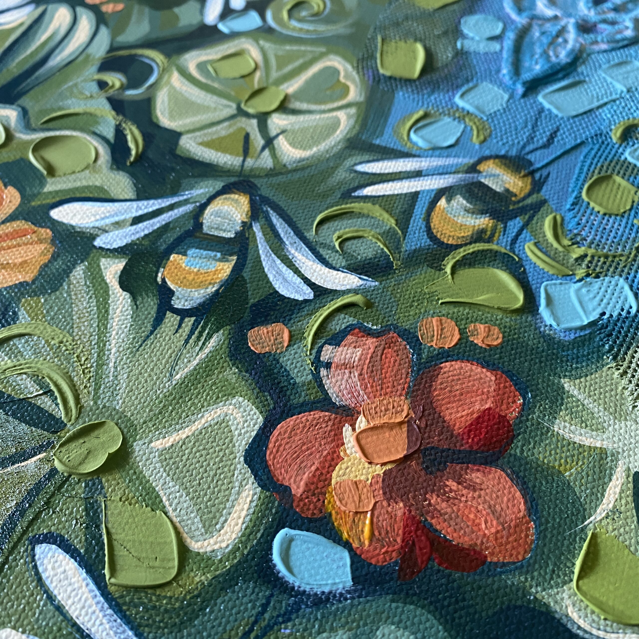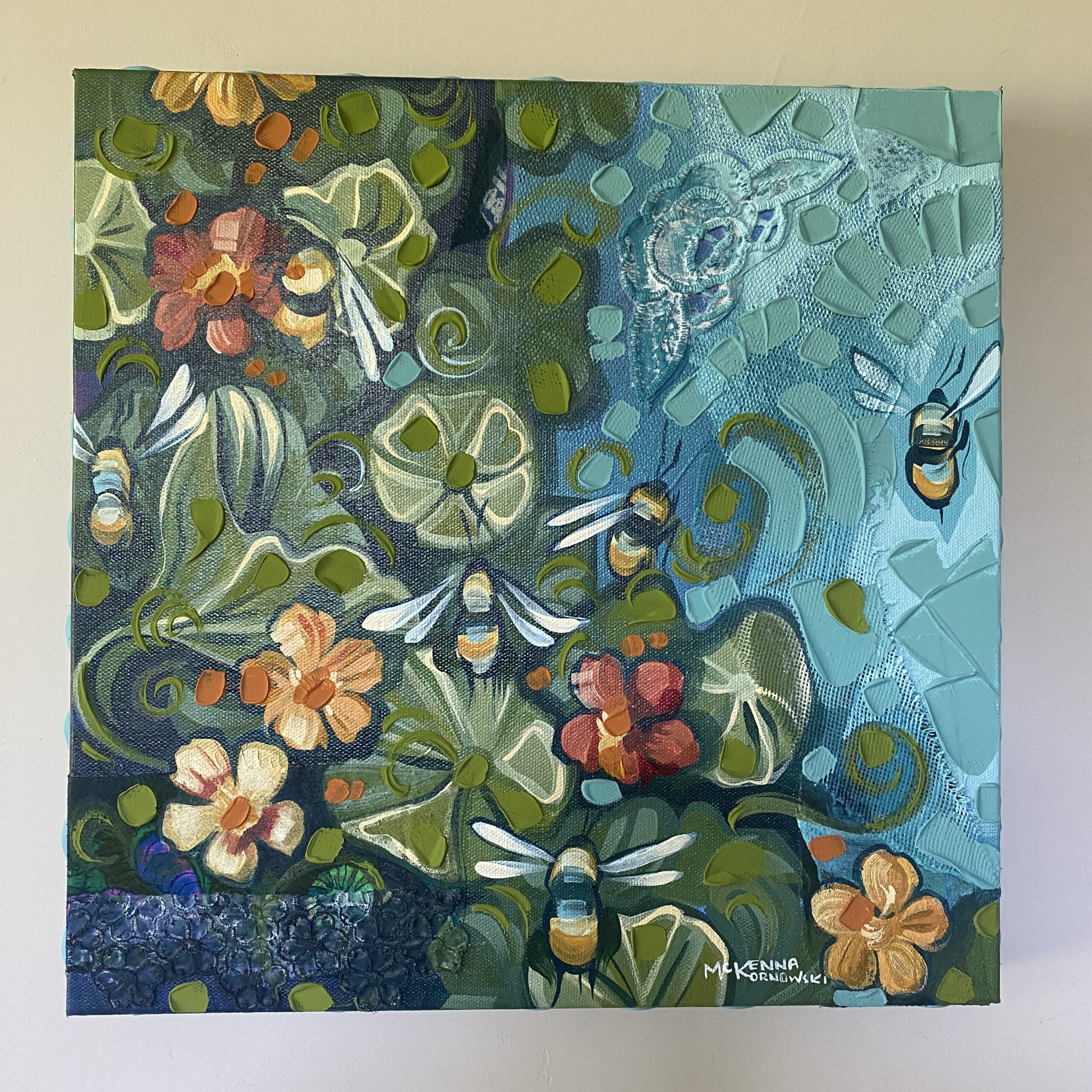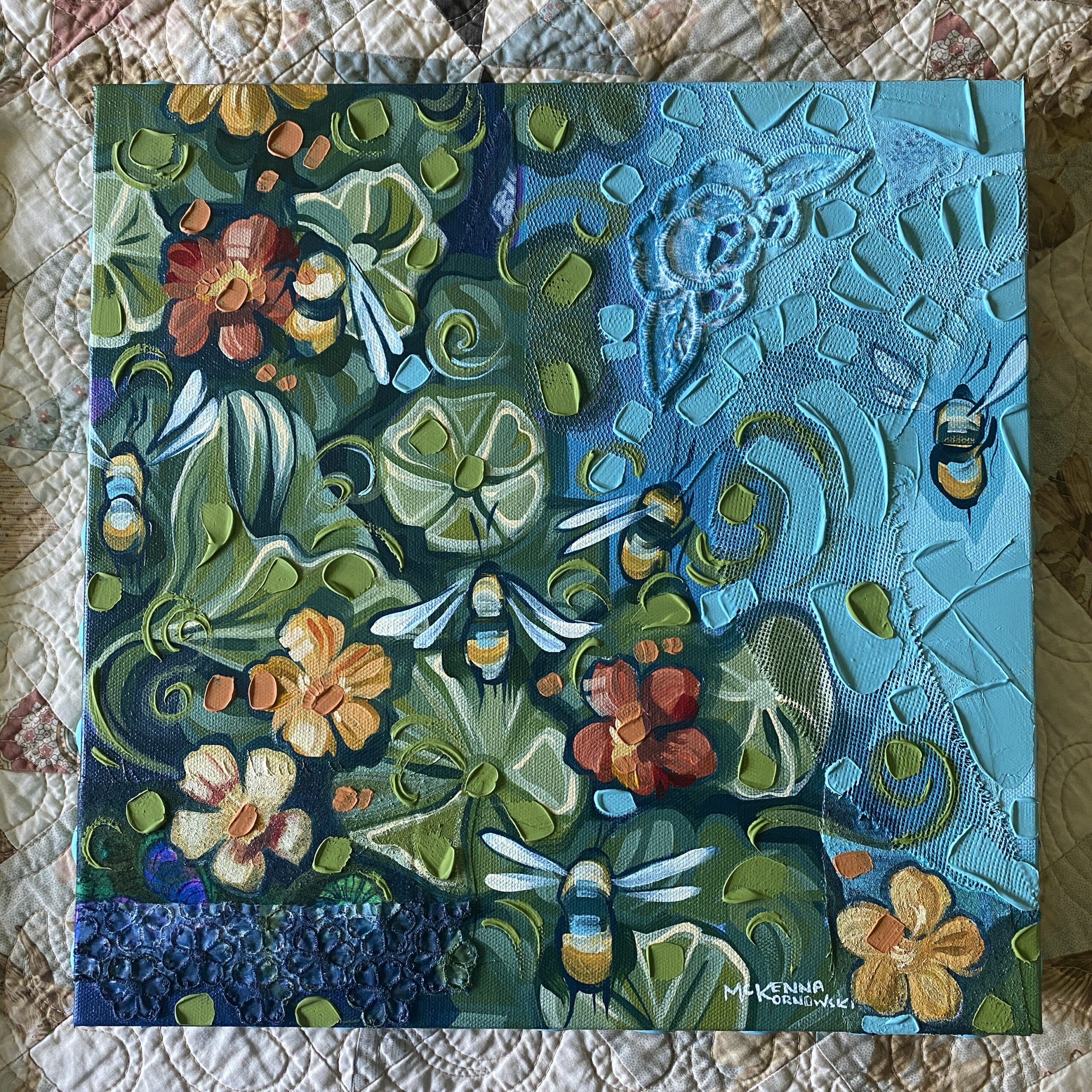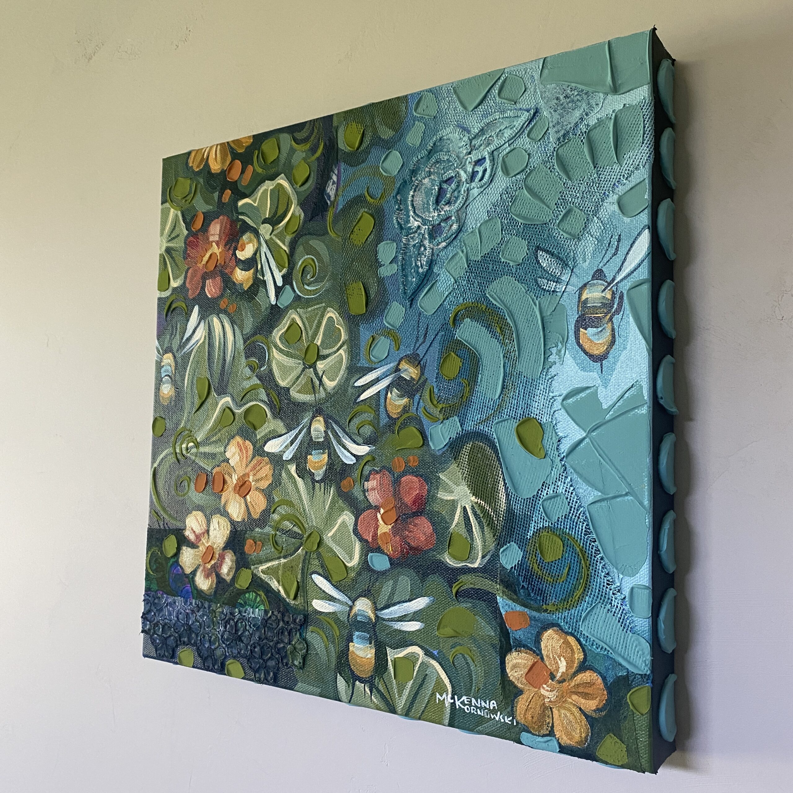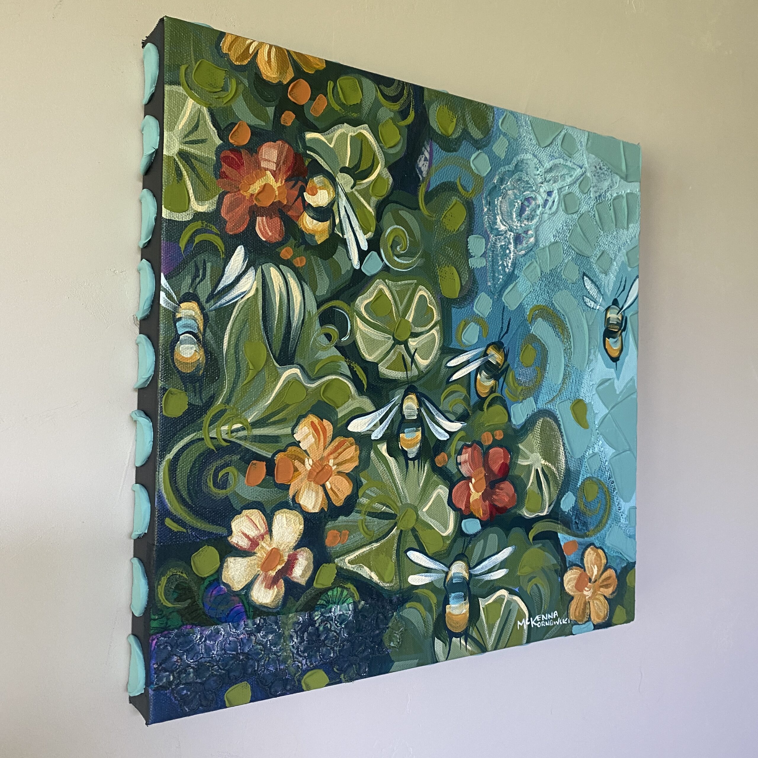 Nasturtiums fascinate me! They are always some of the brightest flowers in the garden each year. I’m drawn to them just like the little bees in this painting. The painting includes parts of repurposed textiles and a discarded table runner. There are also tons of textural marks scattered throughout the painting that have been applied with a palette knife.