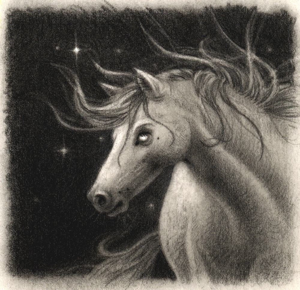 Hearkening back to my ‘horse kid’ days, I felt like drawing this gorgeous creature again, but with my current gently creepy sensibilities. Drawn with matte graphite on paper glazed with iridescent watercolor, this tiny piece glows with just a touch of underlying shimmer. The drawing has been treated with a UV-protective spray, as well as several coats of acrylic varnish so I didn’t have to put it under glass. Ready for hanging in a fancy gold frame!