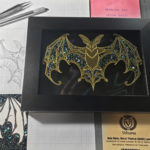 This is the best time of year, with cooler weather and spooky decorations everywhere! This Art Nouveau inspired bat is a perfectly elegant and spooky piece that can be displayed year round. The bat is laser etched in the glass, reverse gilded with 24k gold and 22k moon gold, and inlaid with abalone shell veneer. Reverse gilding is a traditional technique seen in antique glass signs, and produces a mirror finish with gold leaf. All the work is done on the inside of the glass, so it is protected within the frame. It is impossible to show just how wonderfully it catches the light!