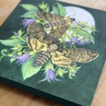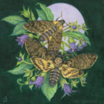 The deadly nightshade plant, Atropa Belladonna, has a legendary dark history, having been used in the poisoning of kings and emperors throughout history. Likewise, the Death’s Head Hawk Moth, long a symbol of mortality asks us to respect the underworld on our short material journey.