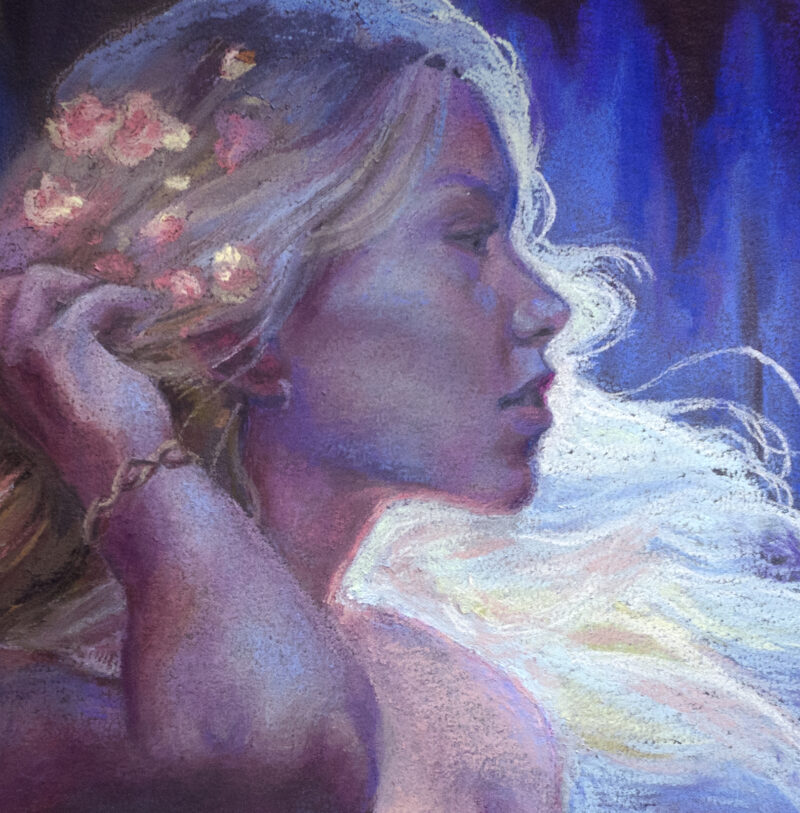 This piece was envisioned to be an ethereal nocturnal nymph. As I learn how to navigate pastels as a primary medium, it has inspired me to play with new color palettes!