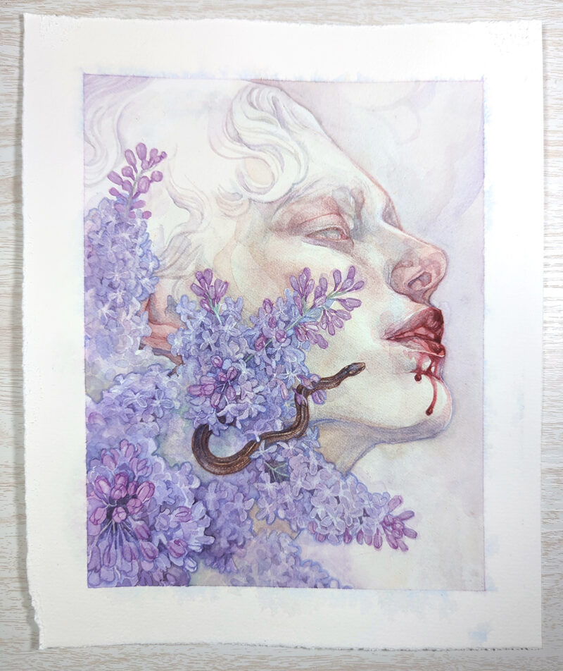 Dory Whynot is an American artist based in the New England region of the United States. Working primarily in watercolor and ink, she focuses on portraiture and the human figure. She creates artwork through themes of nature, fantasy, romance, and the macabre, contextualized in the blurred threshold between physical and surreal states of being. Through her work she also likes to explore the concept of nostalgia and memories, and the physical sensations and emotional states that hold onto them, often taking influence from her childhood growing up in rural Maine.