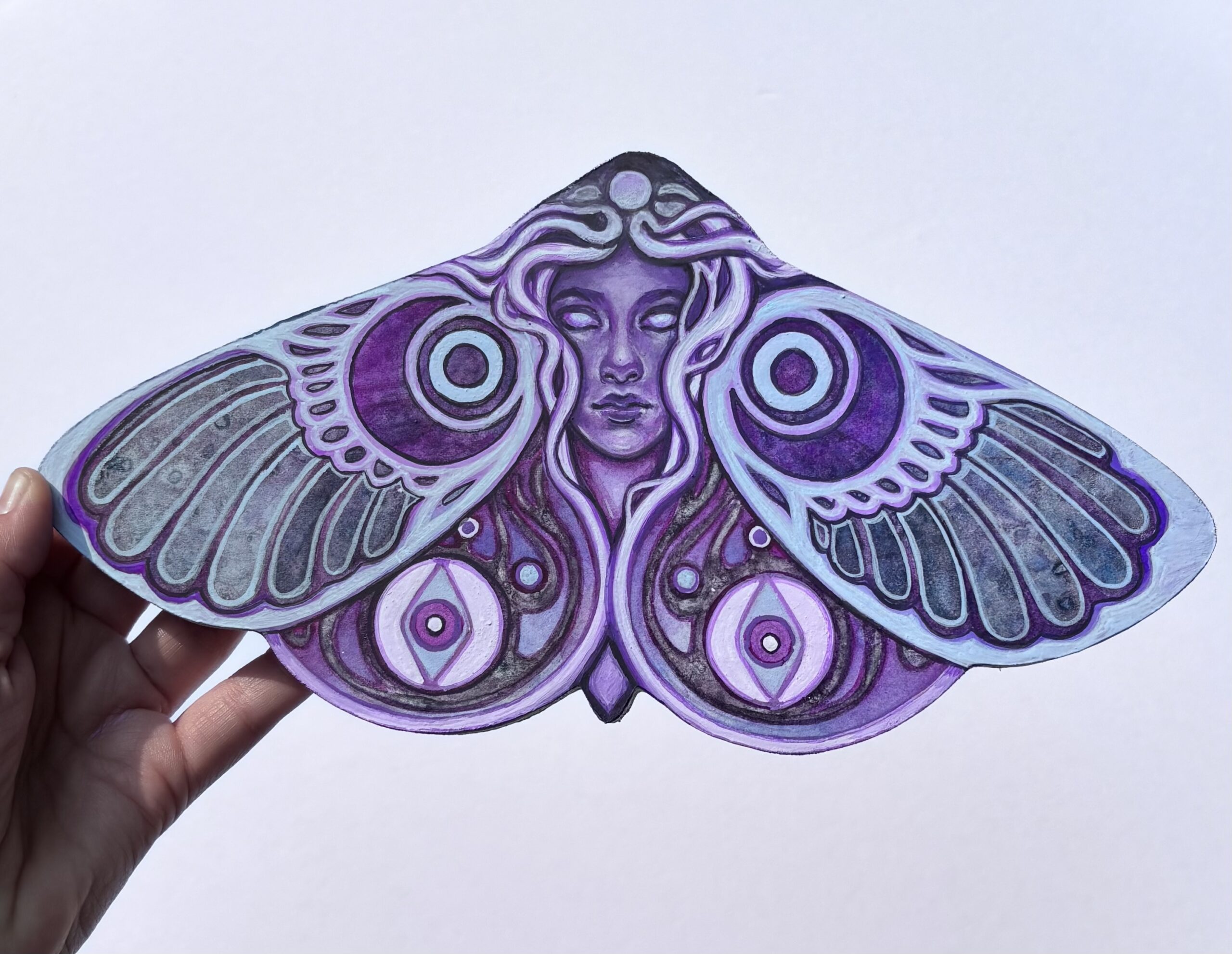 Watercolor and acryla gouache on custom shaped wood panel. Measures 10” across at 1/4” depth. Arrives varnished and ready to hang.