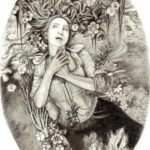 One of my favorite tragic figures from Shakespeare, Ophelia falls into the brook encircled by her collection of wild flowers. She slowly sinks into the waters as she sings broken songs in her madness.