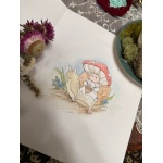 little Amanita is out for a stroll with his snail friend. 5 by 7 water color painting