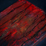 The mixed-media painting features a forest of trees with twisting vines dripping down the surface like allegorical monsters in the darkness. The flaming red and shimmering gold that penetrates through the chaos represents our passion and ability to take a leap of faith into the unknown, despite the fears that surround us at every twist and turn. The painting is a reminder that we are no longer lost in the dark when we follow the light from within.