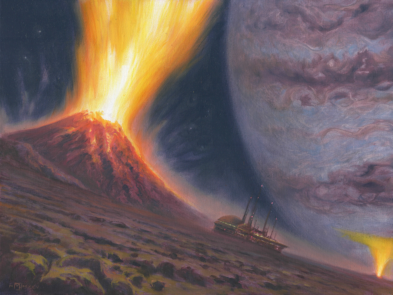 Oil painting on fine cotton canvas of an imagined outpost on the moon of Jupiter, Io. Probably rich in volcanic minerals this civilisation has technology advanced enough to cope with the extremely hostile environment.