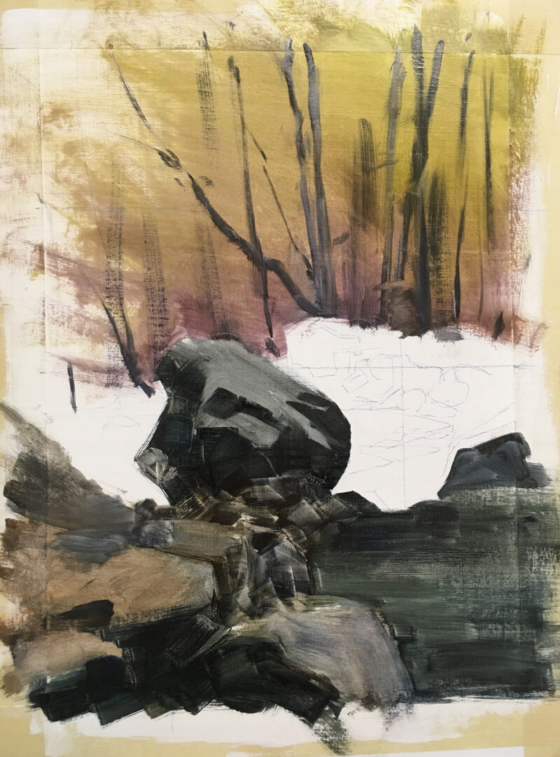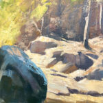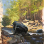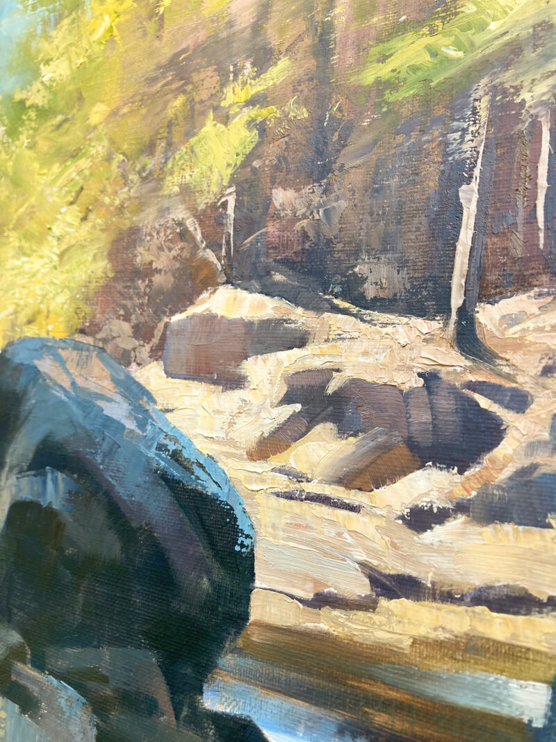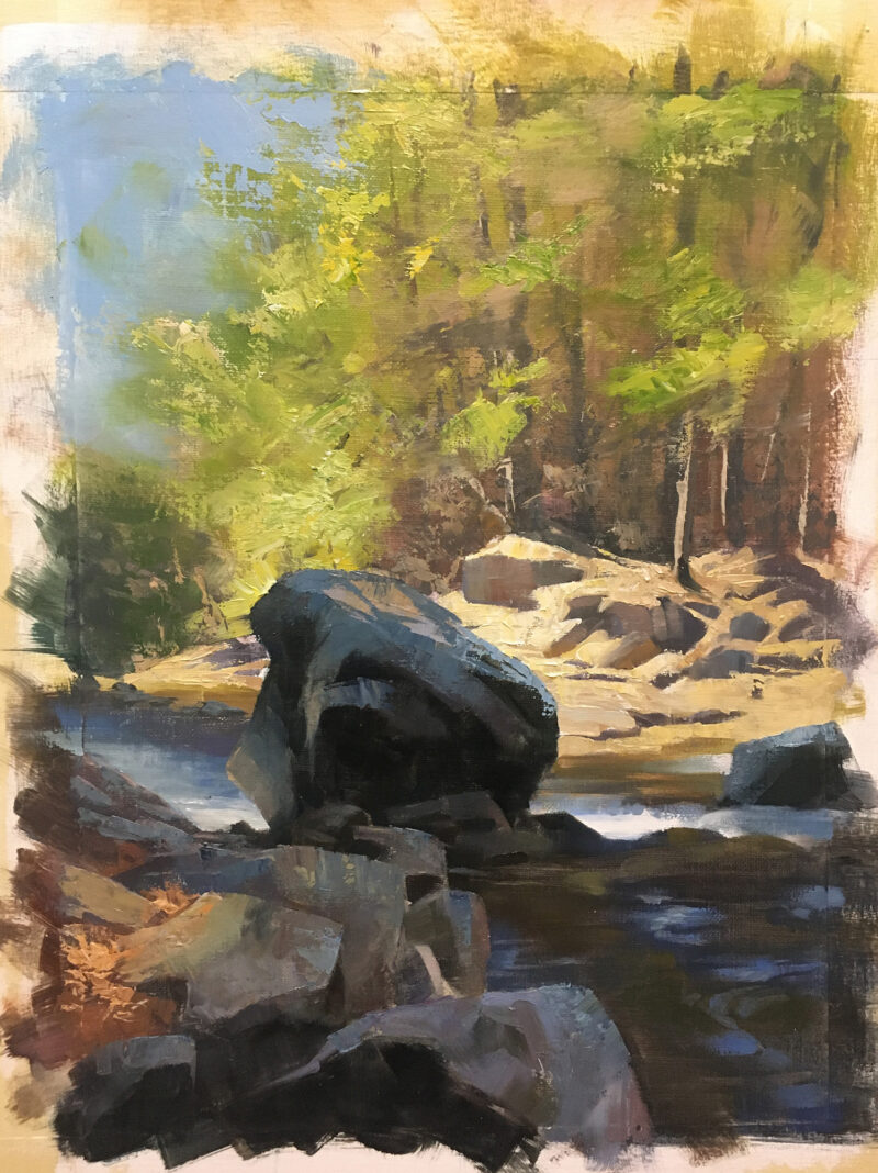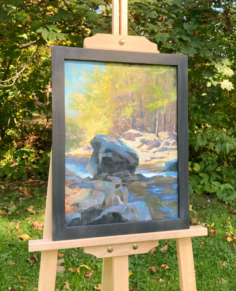 Hubbard brook can be found deep in the Granville state forest by the Connecticut/Massachusetts border.  The river carves wide placid curves through the forest, before tumbling through narrow cuts of bedrock, eventually filling the Barkhamsted Reservoir.  The state forest is beautifully maintained, with gentle hiking trails and a small boat put-in.  On this morning, I was struck again by the contrast of cool shadows surrounding the warm pockets where the sun peeks through.  A warm summer haze was bleeding away as I set up the easel, blurring the far edges of the trees where the river turned again.