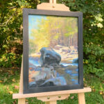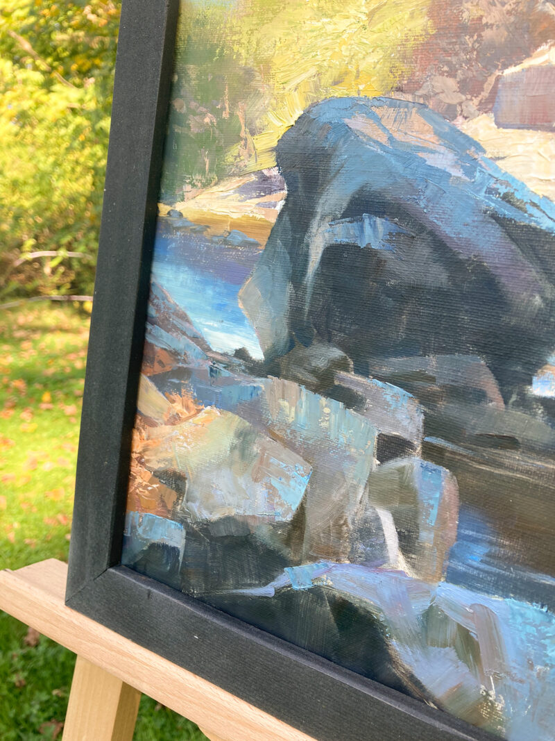 Passing Shadows, Hubbard Brook” is an original oil painting, 11″x15,” oil on stretched canvas, and mounted in a handmade black wood frame
