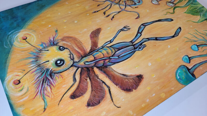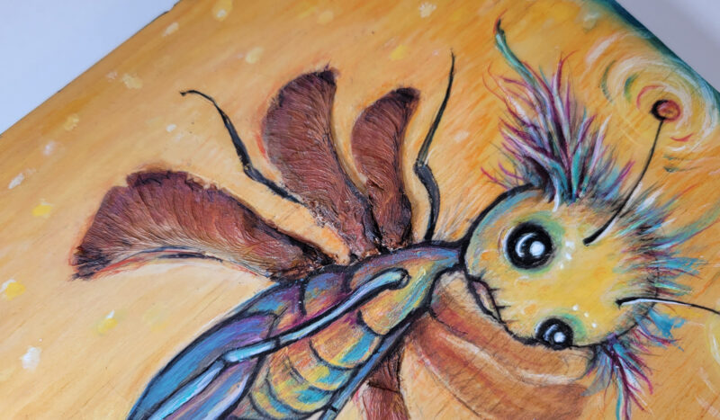 There are elements of this painting that are textured with clay. The wings are real maple seed pods.