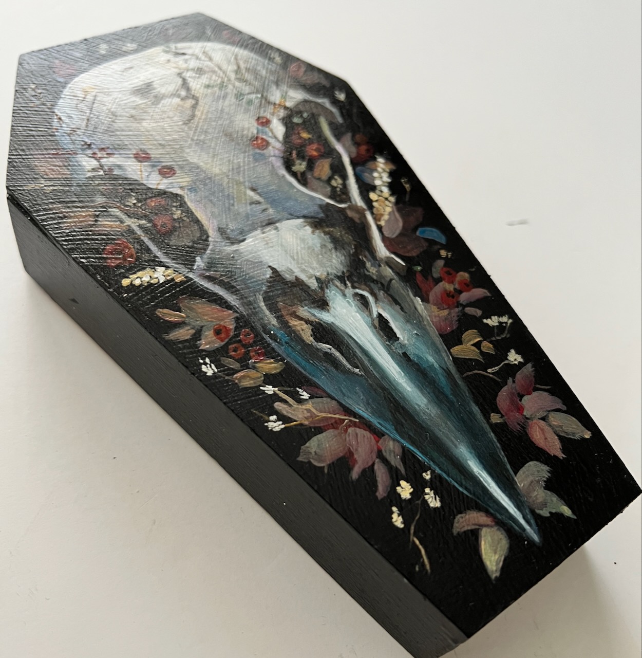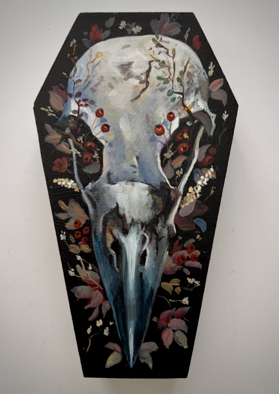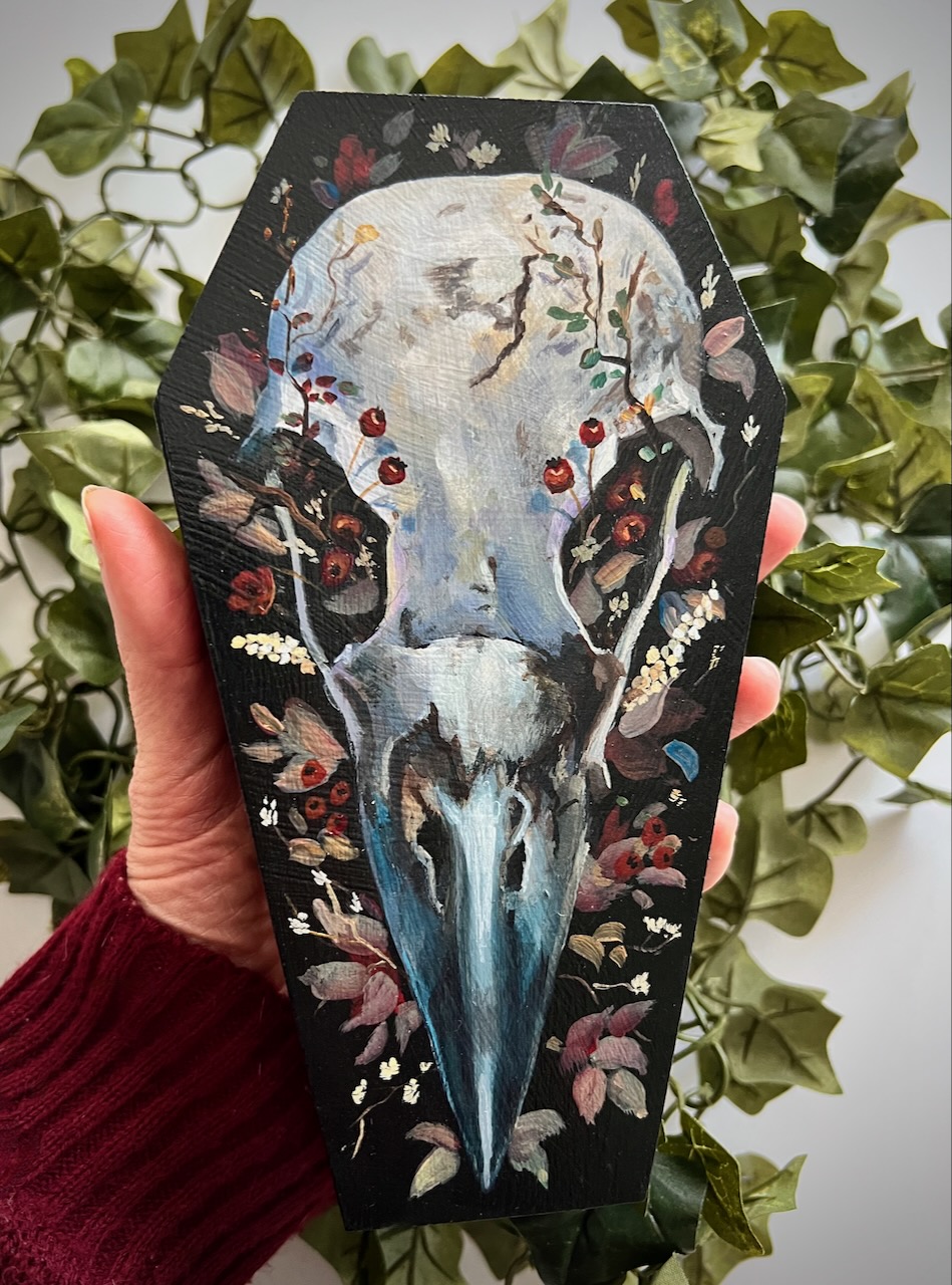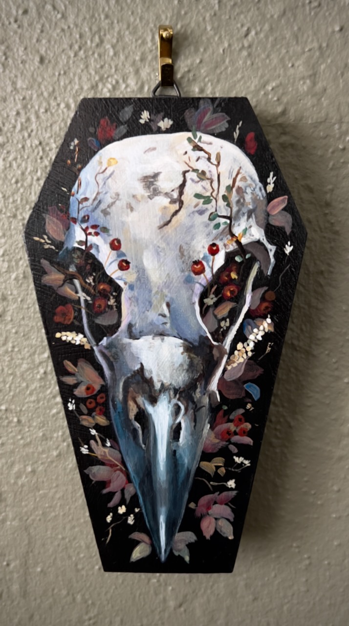 This piece was created on a coffin shaped cradled wood panel, painted in acrylics, and is ready to hang.