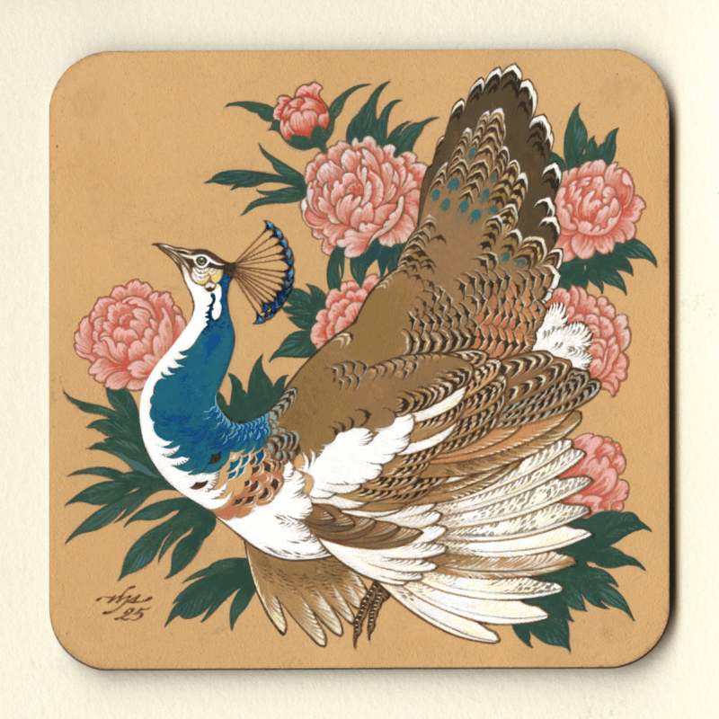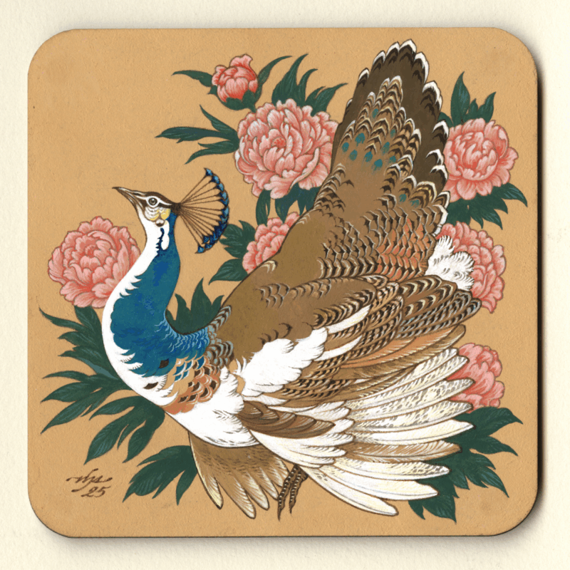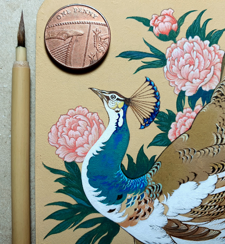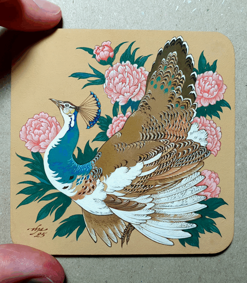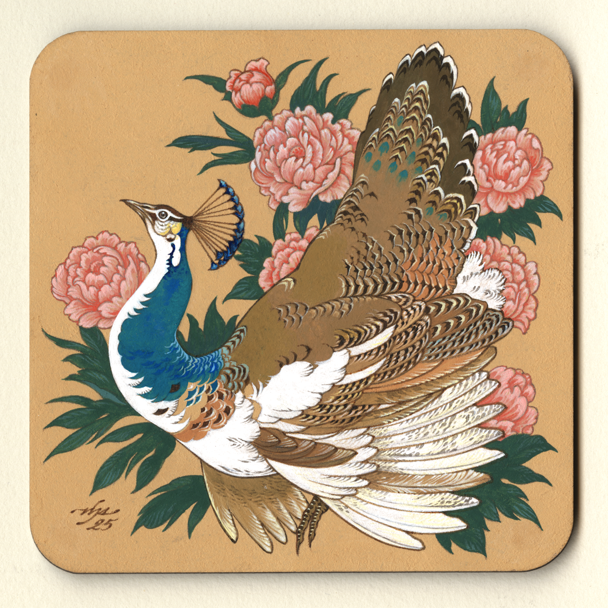 I wanted to paint on coasters like the cool kids. This piece ended up taking an inordinately long time to complete for what I had aimed for as something relatively ‘simple.’ Its being a miniature certainly accounts in part for it, though that in itself is hardly a departure for me. It may have more to do with using exclusively opaque media as opposed to my beloved watercolours; in particular, acrylic gouache, which demands altogether different handling as much as a different mental approach. Acrylic gouache also makes brushes expand; an especially vexing issue for me, so accustomed to my sharply pointed brushes, free-flowing water media, and intricate detail.