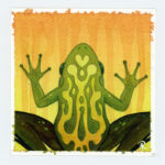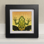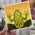 A vibrant acrylic painting of a poisonous frog with colored pencil detail on 4”x4” watercolor paper.