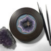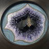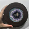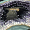“Reflective Solitude” captures a tiny cave bat within an amethyst geode. This piece came of the solitude and meditative reflection I have experienced during the pandemic. The sculpture is made from layered watercolor paper and painted with genuine amethyst pigments. The addition of pearl foil helps to catch the light, shimmering like an actual geode.