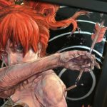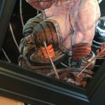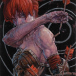 The largest in my recent series of paintings on engraved aluminum. Resilient is all about persevering despite the obstacles in your way (or the arrows in your back). The idea in the recent work is to let the line speak. I am fascinated how linear art can lead the eye. Predominantly all of the rendering is done with a complex web of contoured crosshatching in carefully controlled value ranges. The armor has been engraved and will reflect light as you move around the piece. Executed in FW acrylic and enamel, engraved through to the metallic substrate.