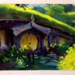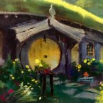 It is fun to paint a landscape with architecture in it, and it’s even more fun to paint architecture as a landscape. I had to come back and visit the Shire one more time. This time I painted it using hobbit brushes and canvas. This is only 3.5 x 10″, fits on almost any wall anywhere. It is painted in colors that can’t quite be photographed with consistency and accuracy, you could better see the vibrant colors that dance about in the foliage.