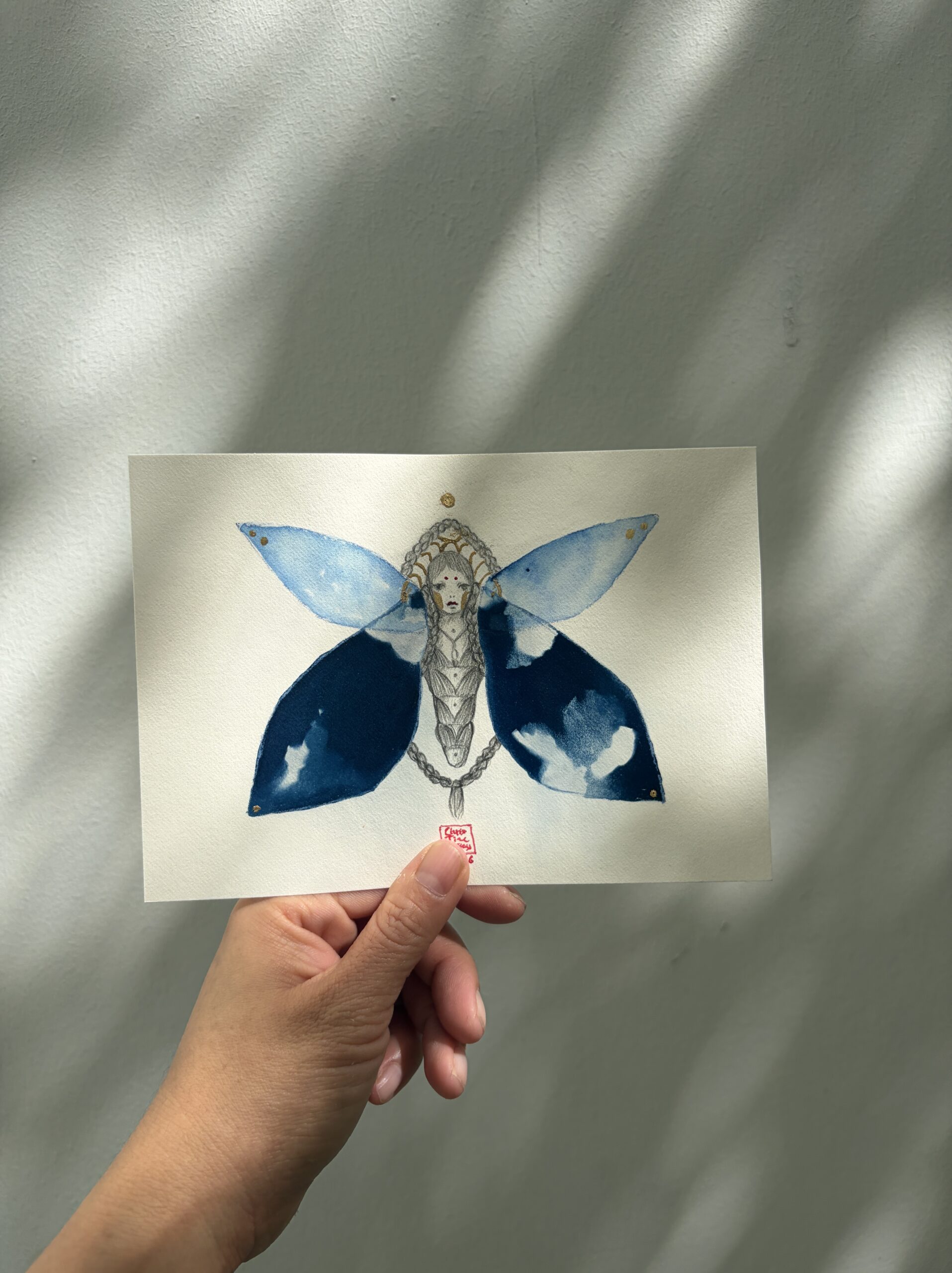 In this piece, cyanotype is combined with watercolors to form a shape loosely inspired by the Oleander Hawk Moth. I have layered some fallen Trumpet tree flowers (it is Trumpet tree blooming season here in Singapore) over the cyanotype chemistry before exposing to full spectrum light. I have also added 24k gold leaf to the piece.
