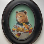 “Sawyer”, a 5×7 oval oil painting on watercolor paper, is of a brown bear wearing a sweater with pancakes, holding a honey bear bottle. Comes in an oval frame (photo).