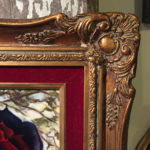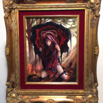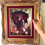 The frame was a lucky find on a recent trip to Vermont, from a little antique shop on the drive up. It’s embellished in gold with red velvet (I love velvet) around the edge, and matches well with the colors in the painting.