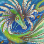 This painting represents water, and is the fourth in my “Elemental Dragon” series of prints and note cards. It joins the other three elements of fire, earth and air. The series will conclude when the fifth dragon joins them, representing spirit~ (also known as aether or space.)
