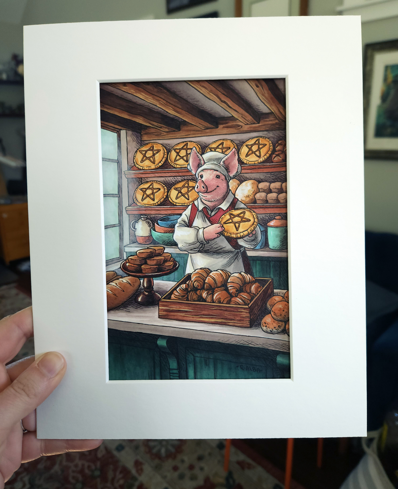 The painting is 4.5 x 7.25 inches, ink, watercolor, and acryla gouache on 190 lb Arches hot press paper. It comes matted to fit an 8×10 inch frame.