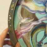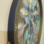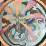 Medium: oils over acrylics over drawing, painted onto round wood. The frame came built onto the panel, which started as flat raw wood. I’ve painted and embellished it with faux gold decor to complement the piece. (See photos for details.)