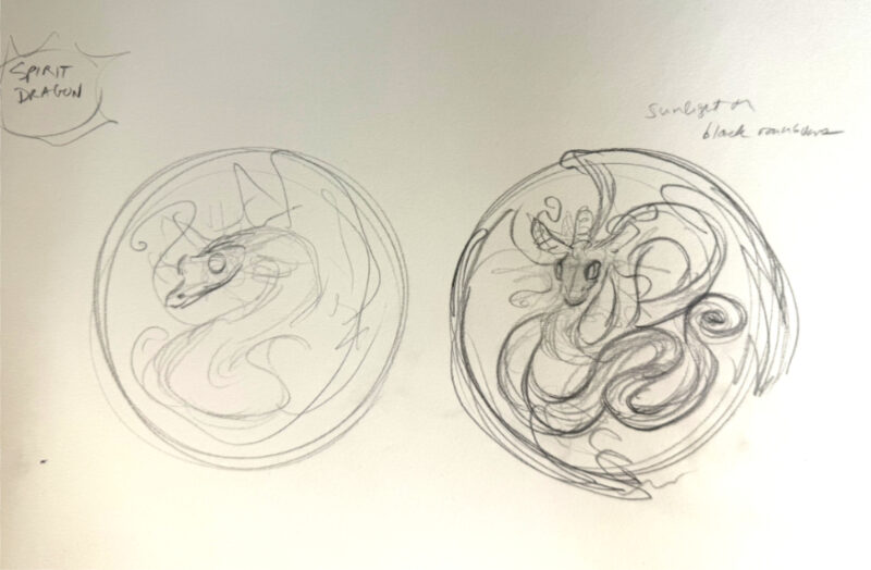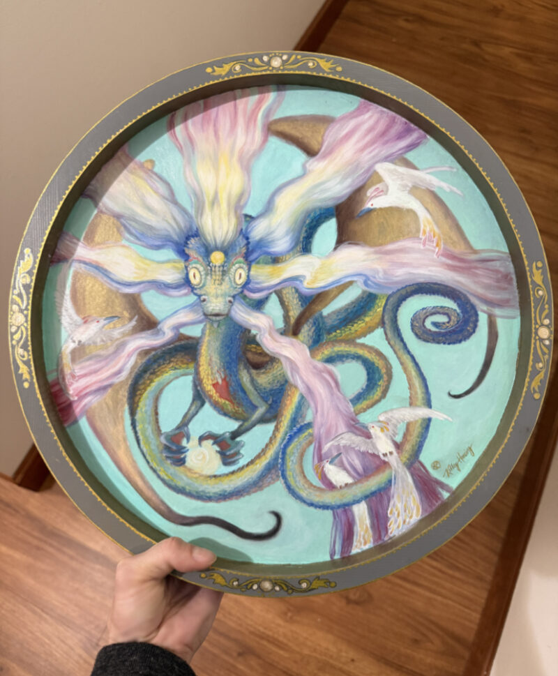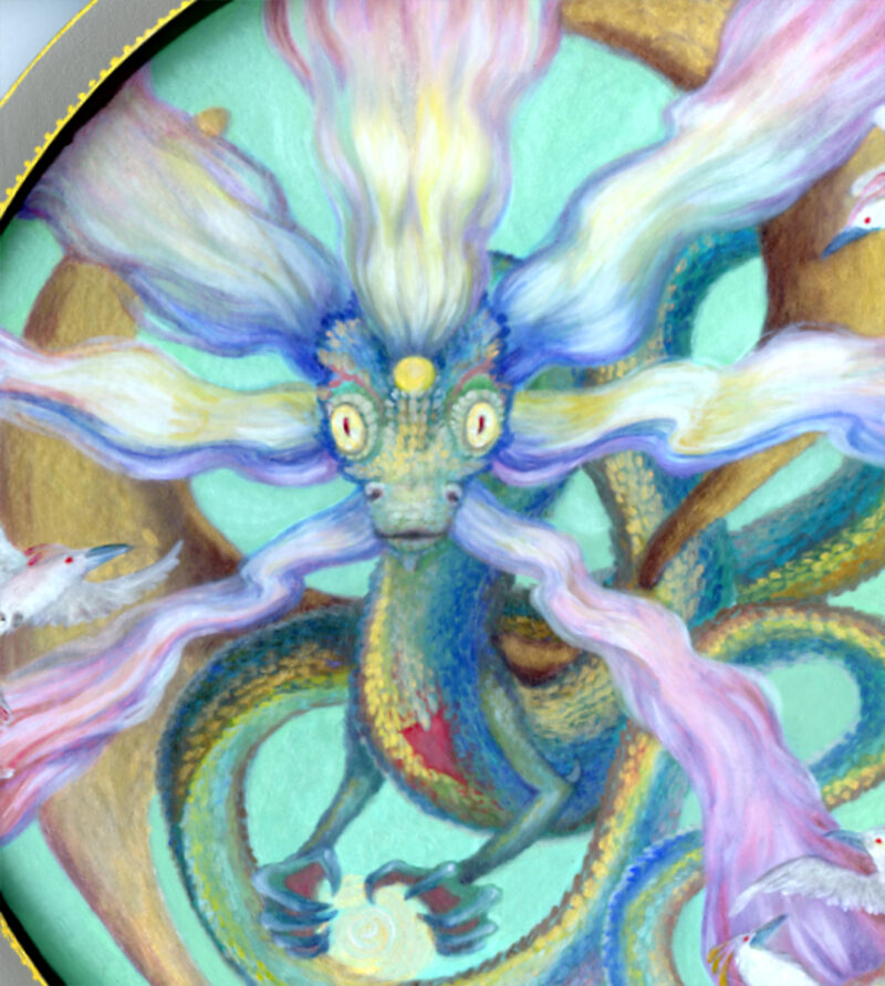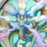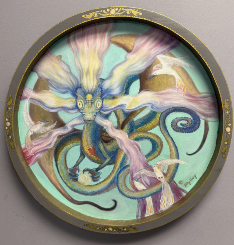 This painting is the fifth and final dragon in my “Elemental Dragon” series. The Spirit Element (also known as Aether, Chi, or Quintessence) is the transcendent energy that bonds the other four physical elements together, known as fire, earth, air and water.